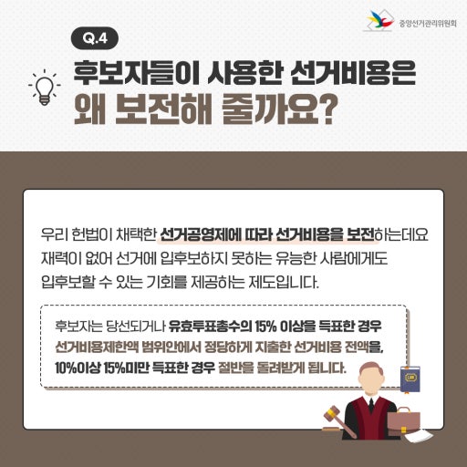 여러분은 선거비용 보전 제도에 대해 어떻게 생각하시나요? 제도 개선이 필요하다고 느끼는 부분이나 궁금한 점이 있다면 댓글로 함께 이야기 나눠주세요!