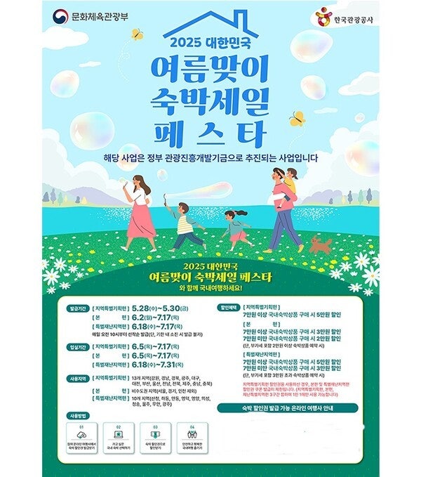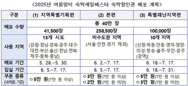 문화체육관광부와 한국관광공사가 함께 추진하는 ‘2025 대한민국 여름맞이 숙박세일페스타’가 오는 6월 28일부터 본격 시작됩니다. 여름휴가철을 맞아 국내 여행을 장려하고 지역경제에 활력을 불어넣기 위한 전국 단위의 할인 행사로, 총 숙박할인권 40만 장이 온라인여행사(OTA)를 통해 배포될 예정입니다.